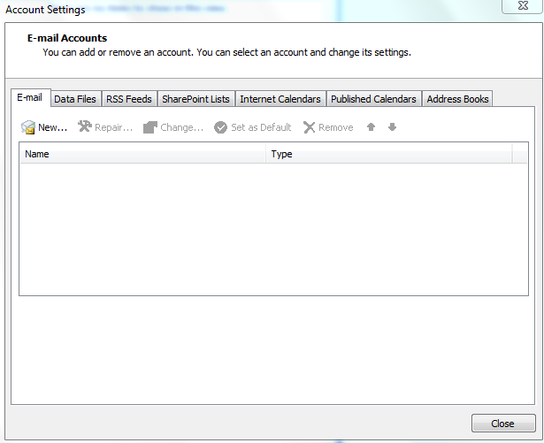Xuất hiện của sổ Email Accounts