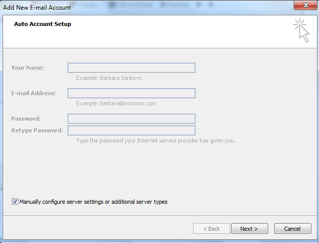 Bước 3: Trên cửa sô Auto Account Setup, check vào Manully configure server … (Phía dưới cửa sổ)