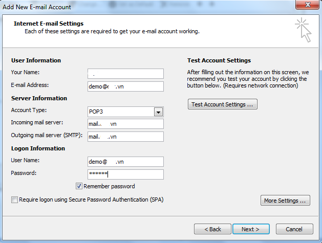 Sau khi điền đầy đủ thông tin, ta nhấn vào More Settings (Góc dưới bên phải cửa sổ Internet E-mail Settings) xuất hiện cửa sổ