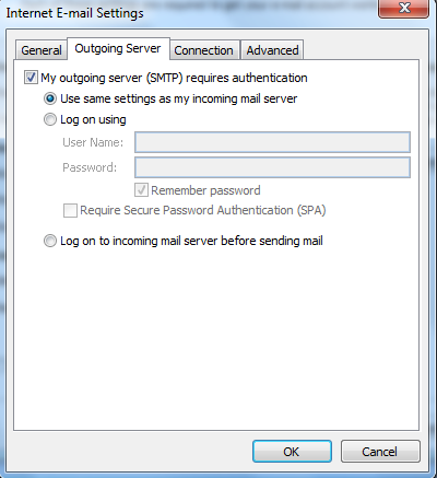 Tại Tab Outgoing Server, check vào My outgoing server (SMTP) requires authentication