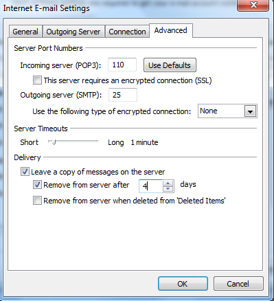 Tại Tab Advanced, lưu ý phần Leave a copy of messages on the server (mục này cho phép lưu lại 1 bản copy trên server, sử dụng chức năng này nếu muốn cài đặt email trên nhiều máy hoặc muốn sử dụng webmail)